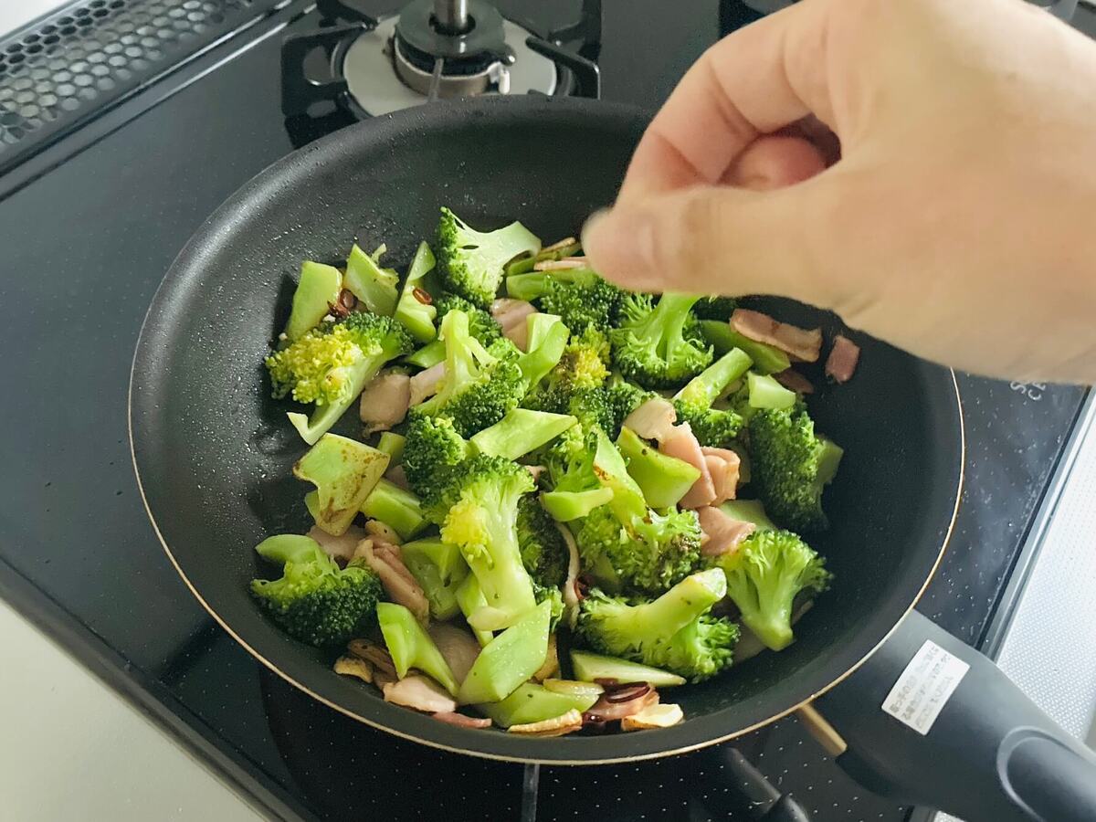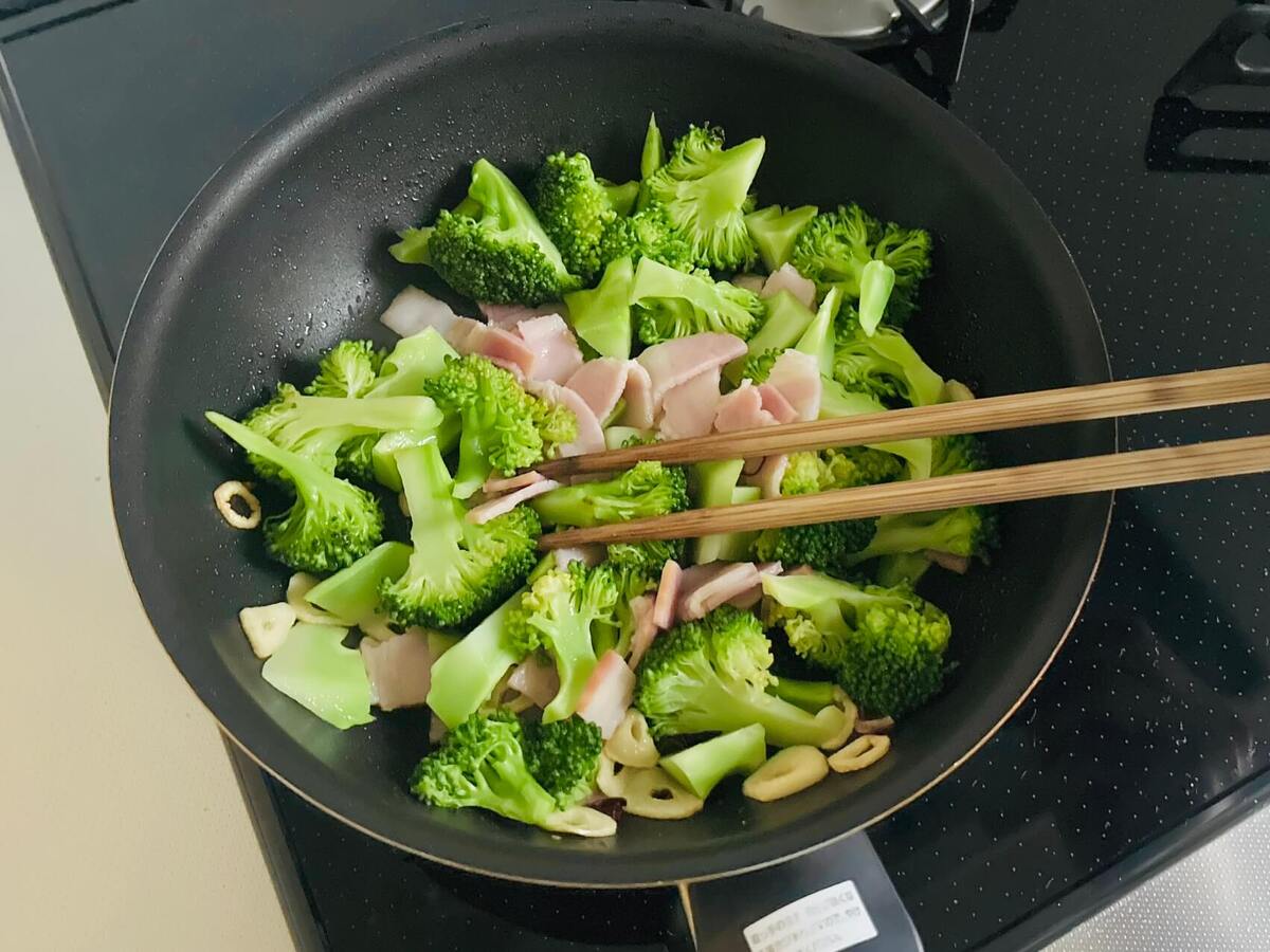 作り方⑤ブロッコリーとベーコンを加えて炒める