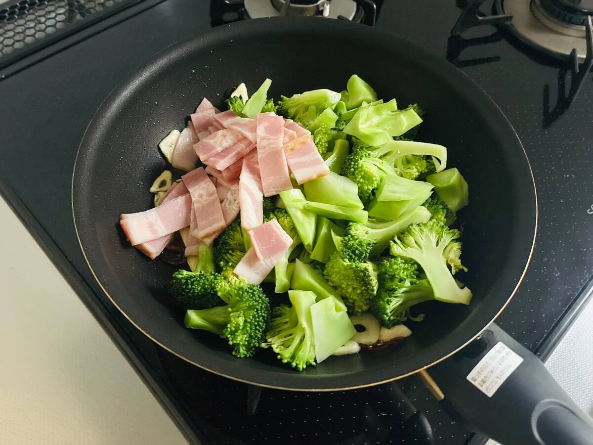 このたまらなく美味しそうな香りの中へ、ブロッコリーとベーコンを投入!中火にして加熱します。