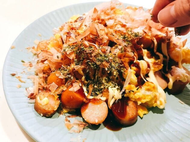 作り方⑤皿に盛り付けて、お好み焼き用ソース・マヨネーズ・かつおぶし・あおさをトッピングしたら完成!