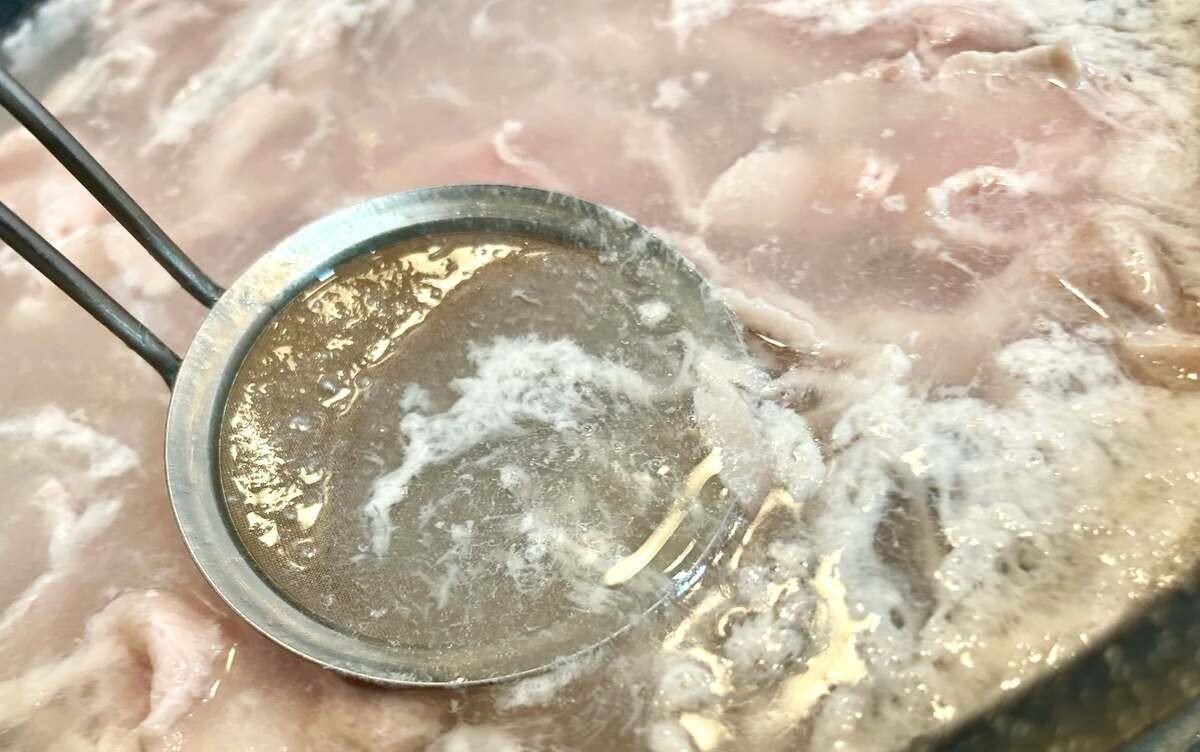 沸いてきたら丁寧にアクを取り除いて、もやしを入れます。