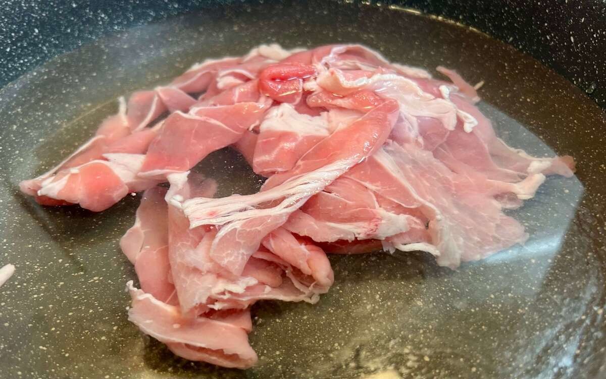 鍋に水と出汁昆布、豚バラしゃぶしゃぶ肉を入れて中火にかけます。