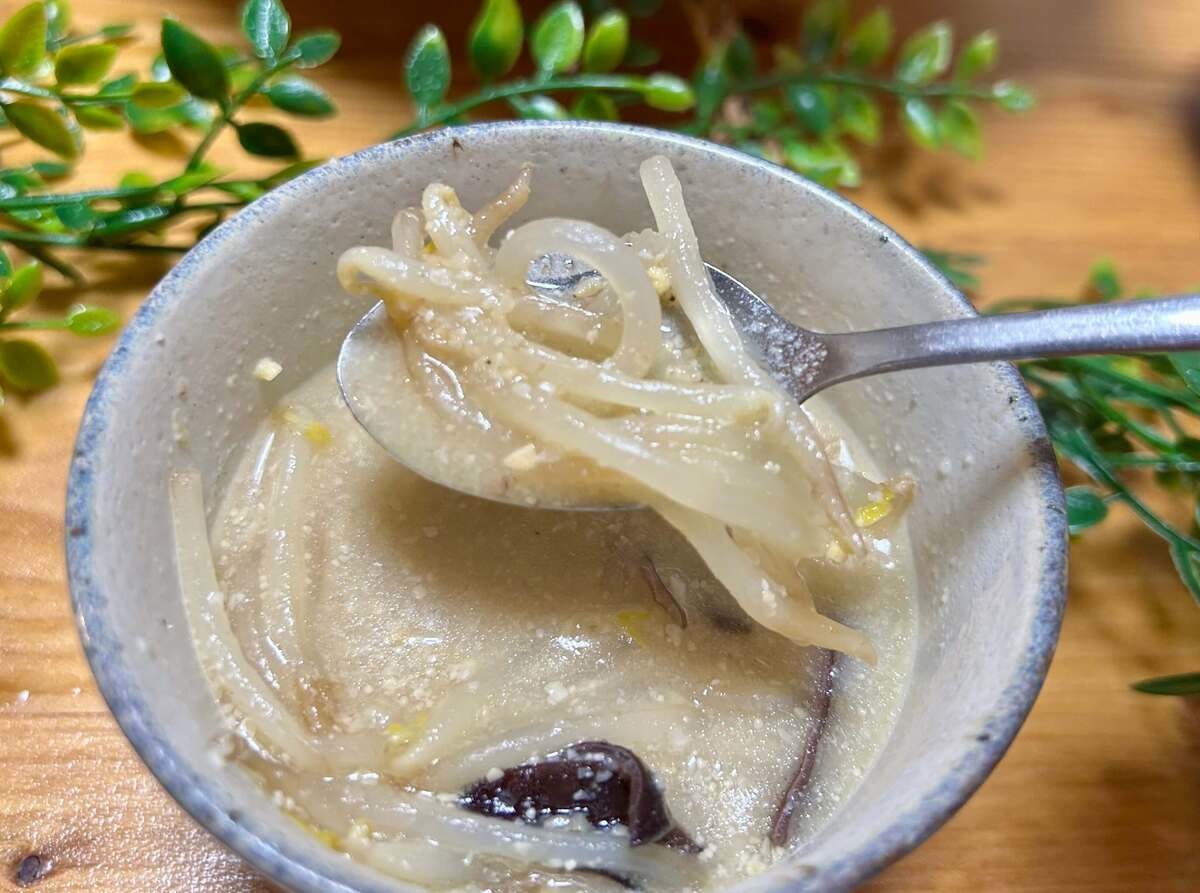 さっそく一口いただいてみましょう。クタクタに煮込まれたもやしは、まるで本物の麺のような食べ応え!スープの旨みをたっぷり吸っていて、一口食べ始めると止まらない美味しさです。
