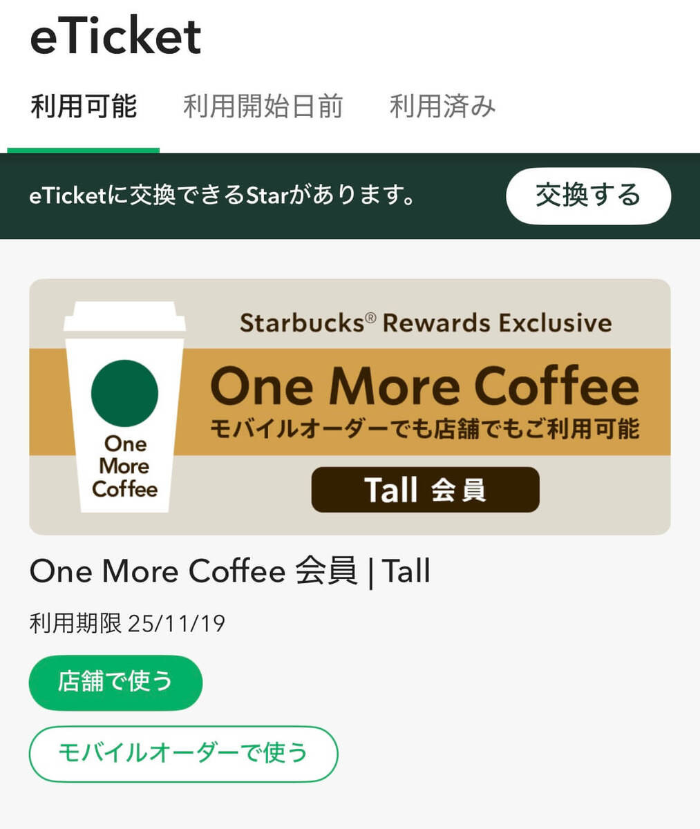 スタバ公式アプリのモバイルオーダーからブリュードコーヒーを注文すれば、One More Coffee eTicketが発行されるのでレシートを失くす心配もなく、安心して2杯目を楽しめますよ。