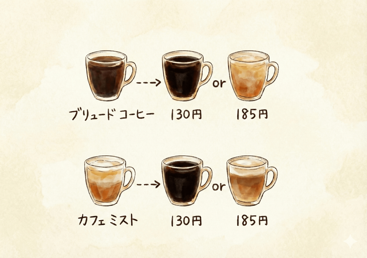 価格は上のようになり、実は1杯目も「カフェミスト」にすることが可能ですし、1杯目「ブリュードコーヒー(ドリップコーヒー)」、2杯目「カフェミスト」という選択も可能!