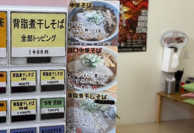 お店のラーメンは中華そば、濃口中華、背脂煮干しそばの3種類。