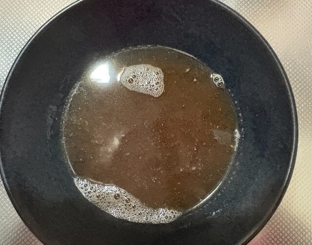 ④麺が茹で上がる少し前に器のお湯を捨て温めたスープを器にうつします。