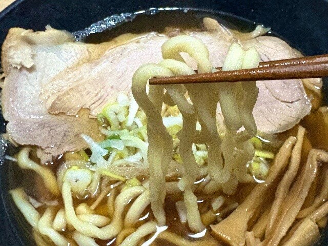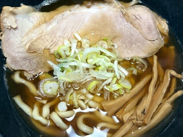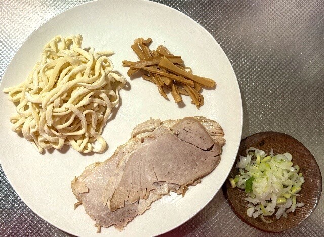 ⑤麺のお湯を切って器に盛ります。チャーシューが大きいので見た目の存在感に大満足です。