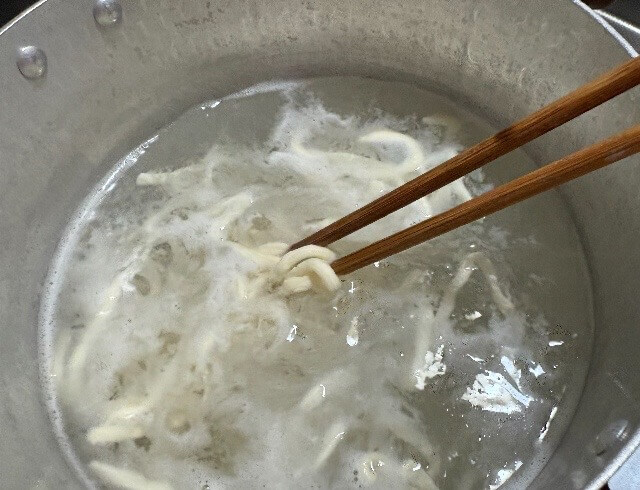 ①沸騰したお湯に麺1人前を入れほぐしながら約4〜5分茹でます。火傷と吹きこぼれに気をつけて茹でてくださいね。この間にスープを作りましょう。