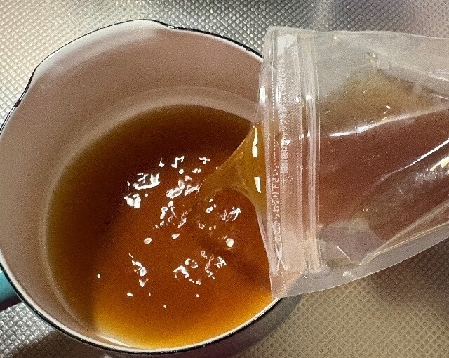 ②1人前のスープを鍋にあけて温めます。袋を開けた瞬間、煮干しの良い香りがしてお腹が空いてきました。