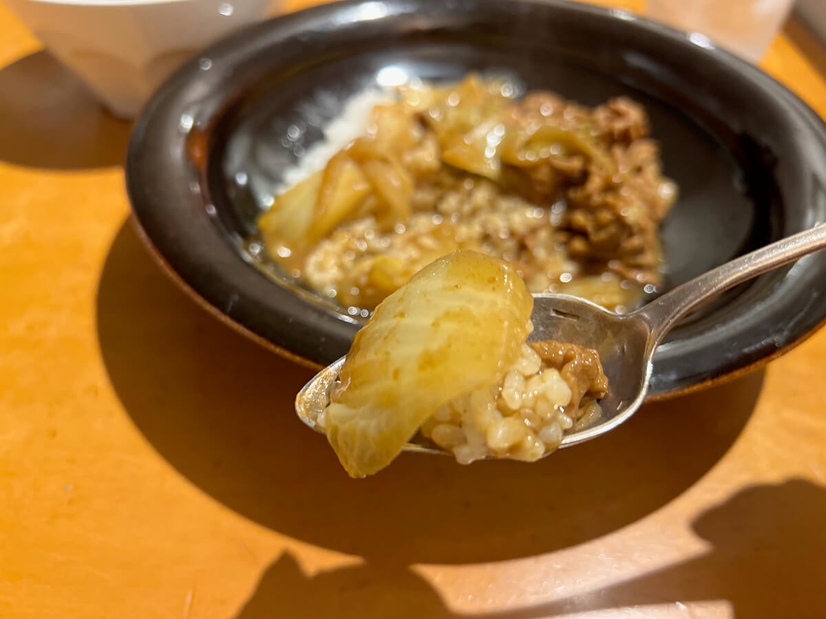 スパイスもそんなに強くないまろやかなカレー。白菜の甘さが口の中に広がります。根菜ではない野菜たっぷりの食感が新鮮です。