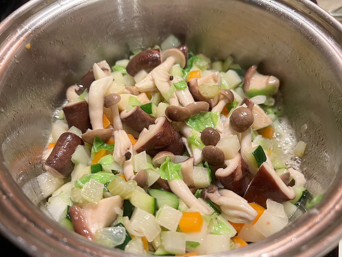 水3+3/4カップ(750ml:分量外)を加え、弱めの中火で野菜が柔らかくなるまで10分間ほど煮ます。