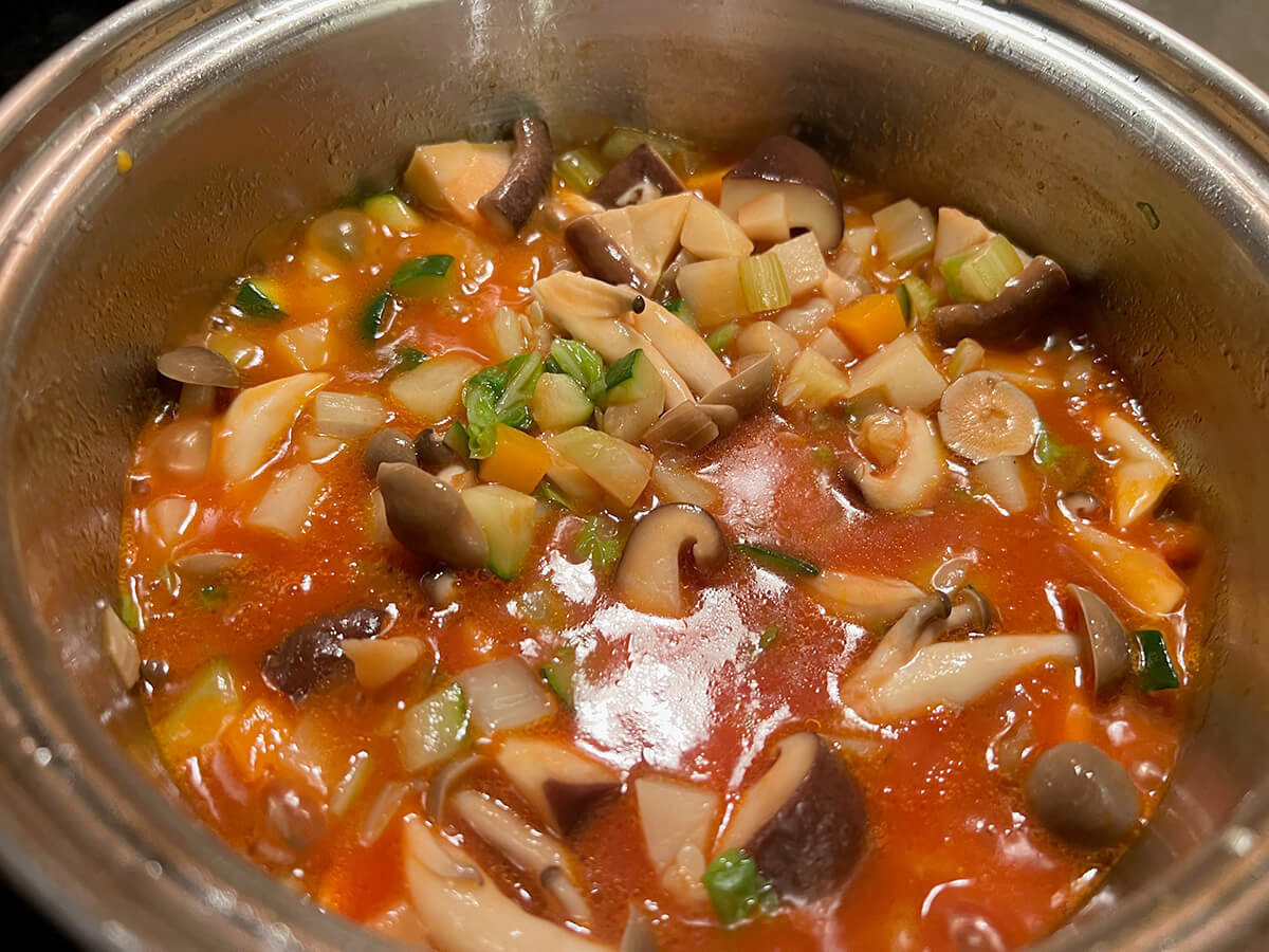 じっくりと、様々な野菜を炒めたところにトマトジュースを加えて煮詰め、そこに水分を加えて仕上げていくのですね。本来は水ではなくだし(スープストック)なのだろうと思われます。