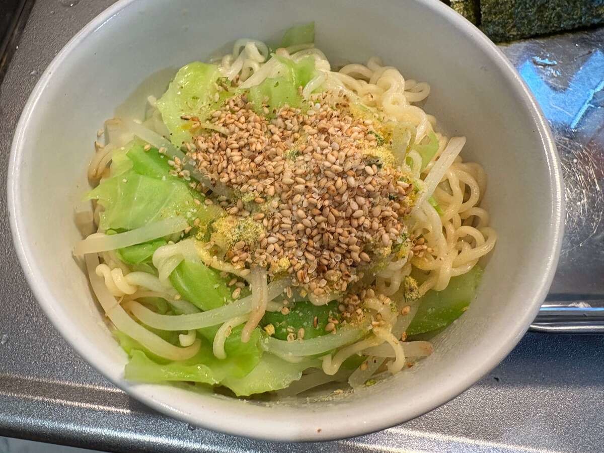 取り出した麺と具材に、粉末スープと切りごまを直接絡めます。