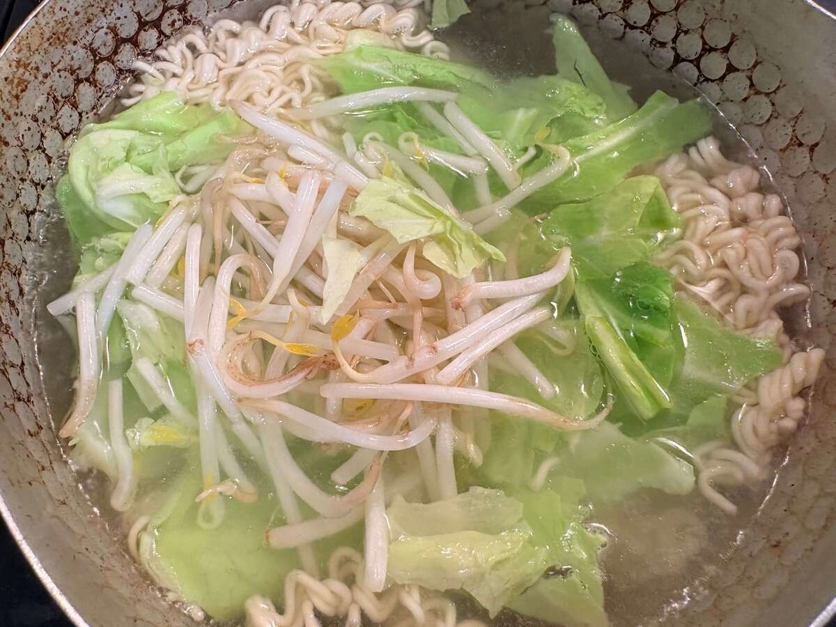 麺を入れて1分ほど経ったら、もやしとキャベツも鍋に入れます。