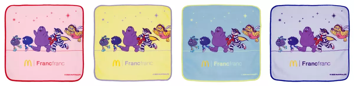 パステルカラーのハンドタオルです。マクドナルドファミリーのグリマス、ハンバーグラー、バーディ、フライフレンズと、Francfrancらしいカラーリングで、お出かけ気分を高めてくれるアイテムです。
