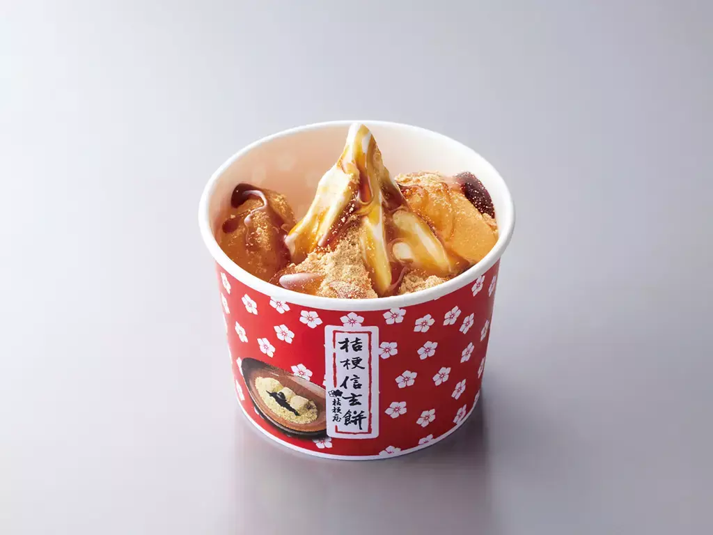 山梨県の銘菓「桔梗信玄餅」の『桔梗屋』監修の「ぐるぐるまぜてね きんぐスロッピー」です。柔らかいお餅、風味豊かなきな粉、濃厚な黒蜜で食べる新しいデザートをぜひお試しください!