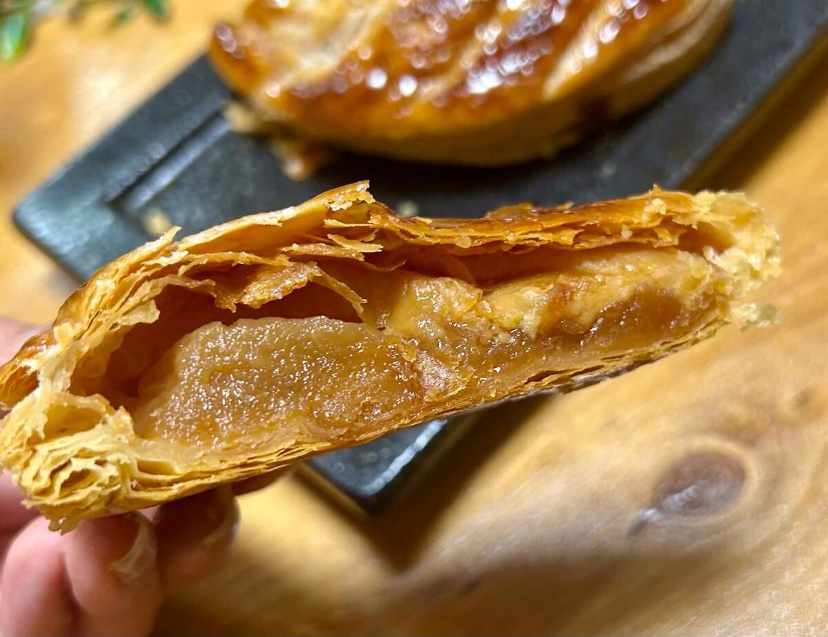パイ生地はサックサク!内側に入っているリンゴがとてもジューシーで、芳醇なバターの風味とリンゴの甘酸っぱさのバランスがたまらない……。1口食べ始めると止まりません!