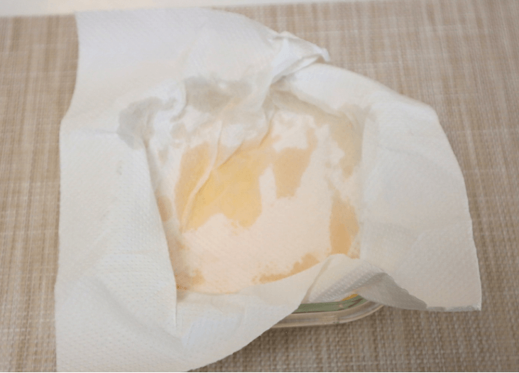 粗熱が取れたら、上からペーパータオルなどで軽く押さえて卵焼きをイメージしながら形を整えます。
