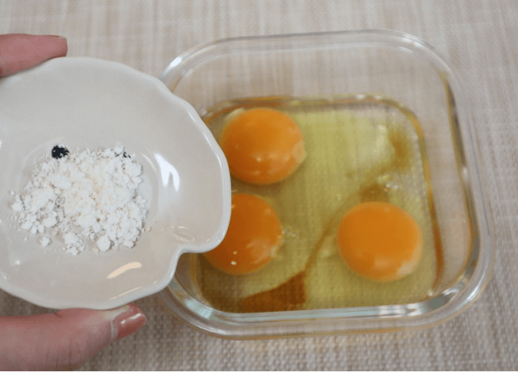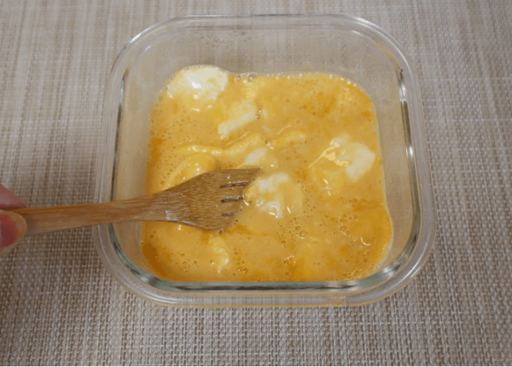 この後電子レンジで調理しますが、白身がかたまりのままだと破裂しやすいため、フォークなどでしっかりとなめらかに溶いておくのがポイントですよ。