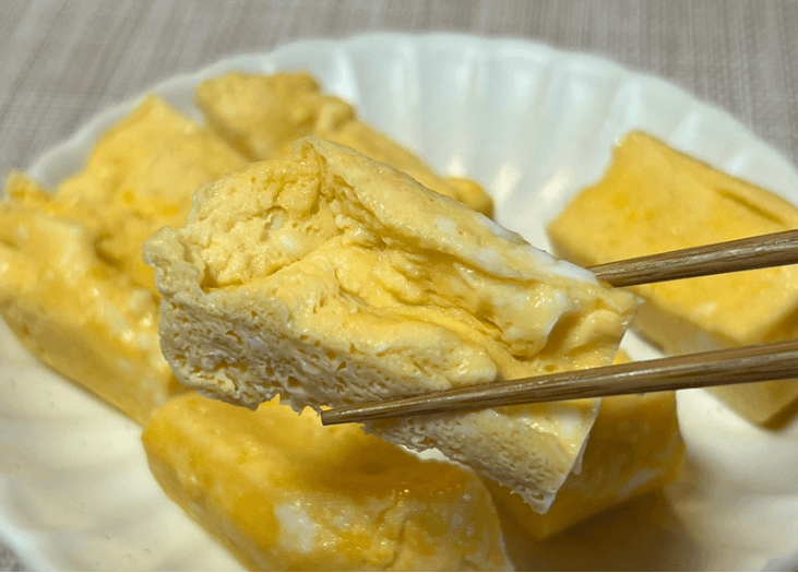 見た目はよく混ぜたおかげか綺麗な黄色で、ツヤツヤと美味しそうな卵焼きです。