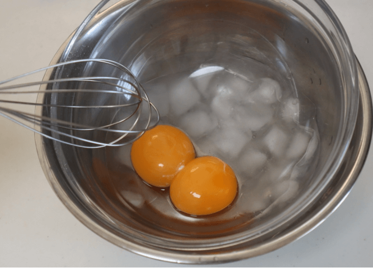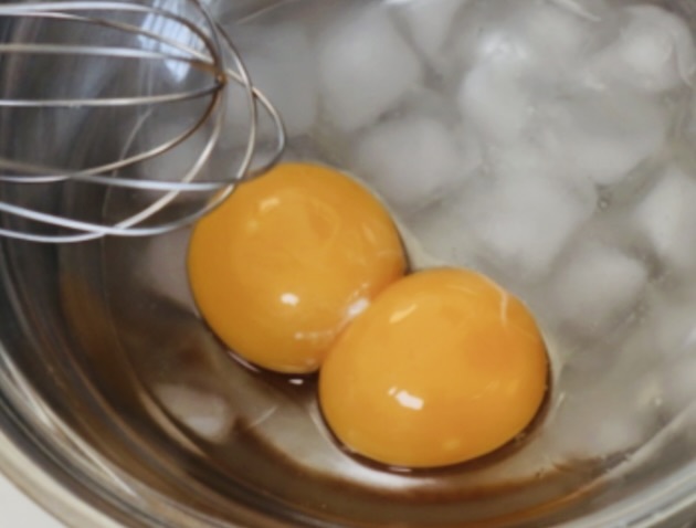 作り方③ 氷水で冷やしながら卵黄を混ぜ、ソースを作る
