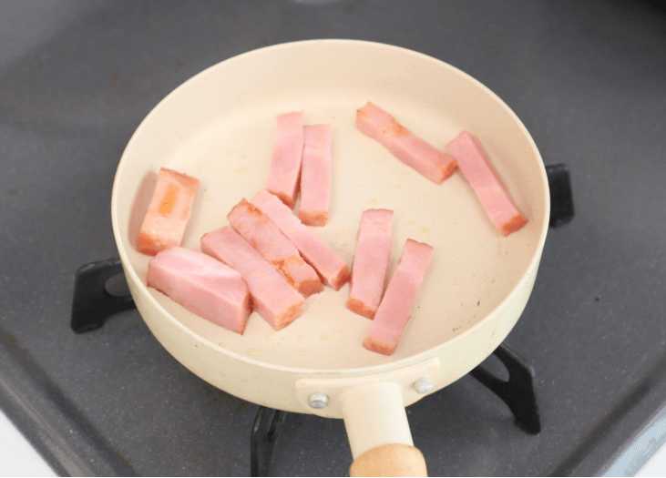 ベーコンは5mm〜1cm幅くらいの大きさに切り、フライパンでカリッと炒めます。