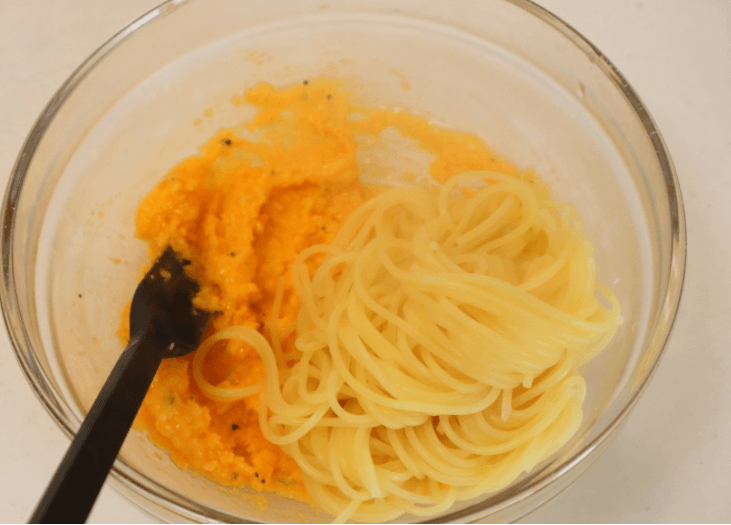 ソースを冷やしているので茹でたてのパスタでも卵黄が熱でかたまってしまうことなく、混ぜていくうちにクリーミーで美味しそうなカルボナーラになってきました……!