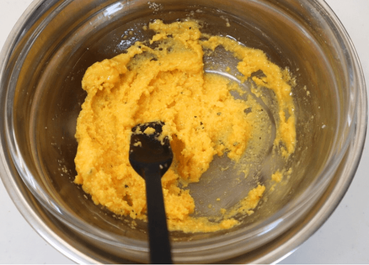 1〜2分くらい混ぜていくと、だんだん卵黄がとろ〜っと重くなってきて、色も少し明るくなってきました。