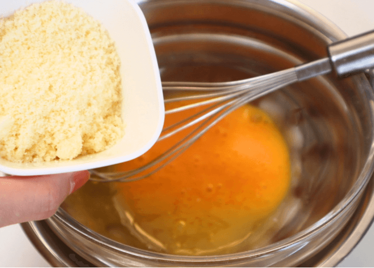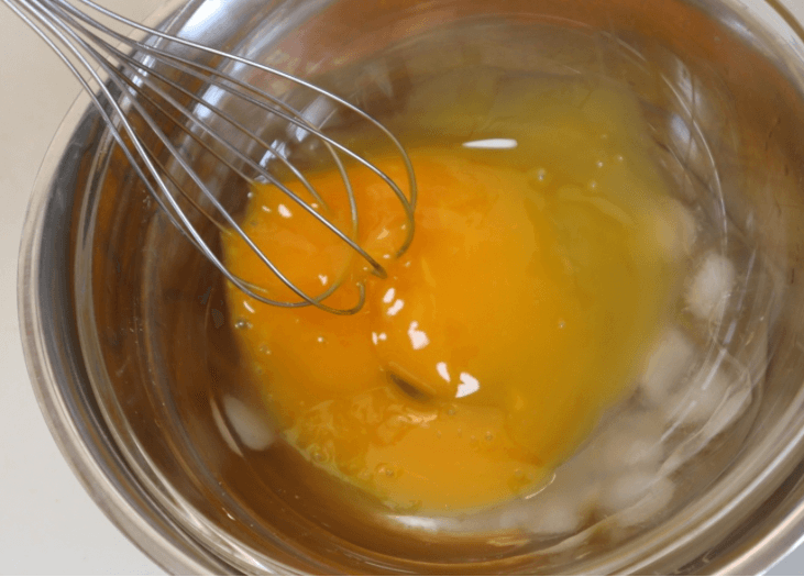 上のボウルに卵黄を入れて、泡立て器でくるくるとかき混ぜましょう!