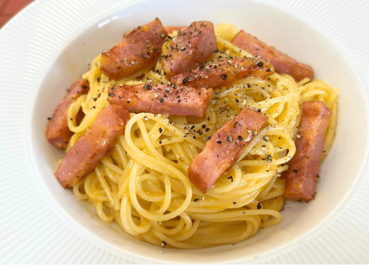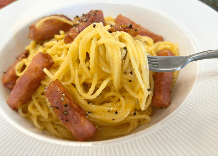 カルボナーラといえばベーコンの旨みも美味しさのポイントなので、なるべく厚切りのものがおすすめですよ♪