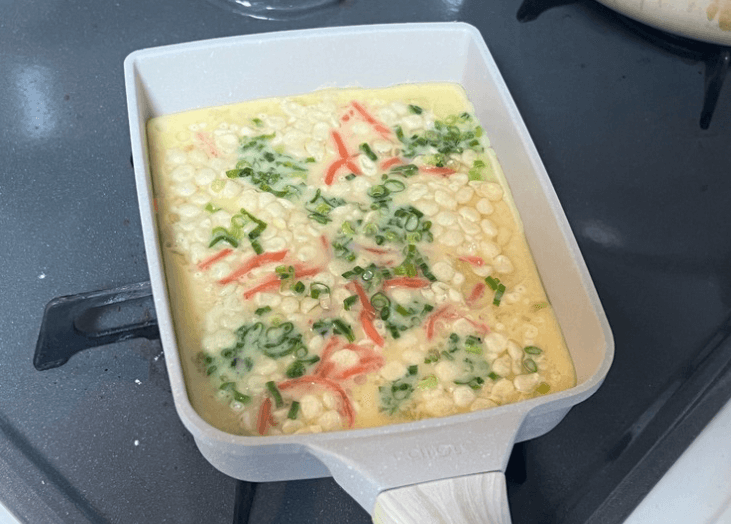 四角いたこ焼きと聞いてピンと来た方もいるかもしれませんが、「カクたこ」は卵焼き器を使って作るんです。