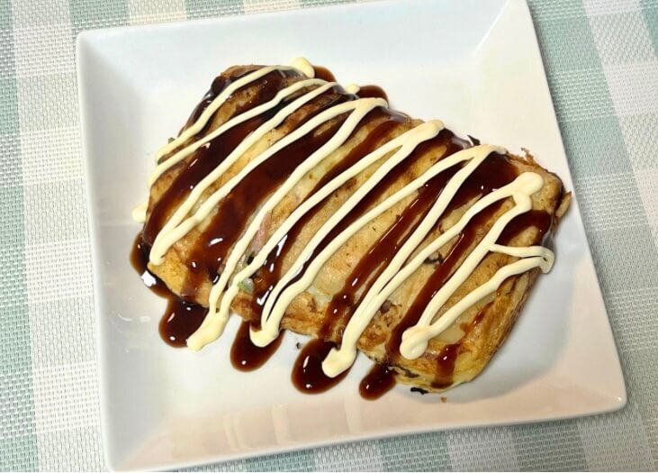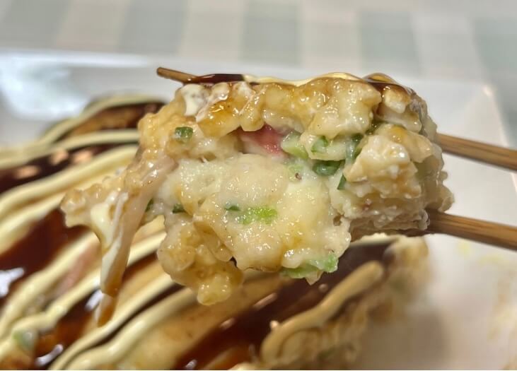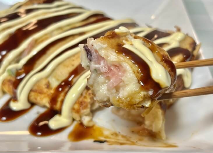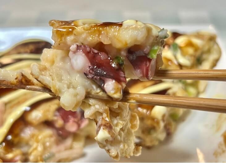 やはり丸くないと脳がたこ焼きと認識しないのか?と思いながらも、切り分けて食べてみると……しっかりたこ焼きの味で思わず笑ってしまいました(笑)。