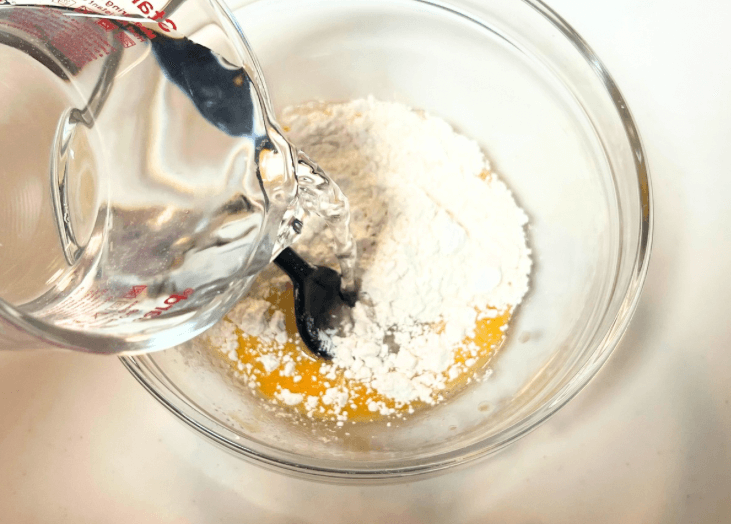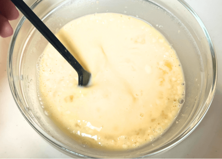 ボウルに卵を割り入れ、水・たこ焼き粉を加えてダマがなくなるまで混ぜて生地を作ります。