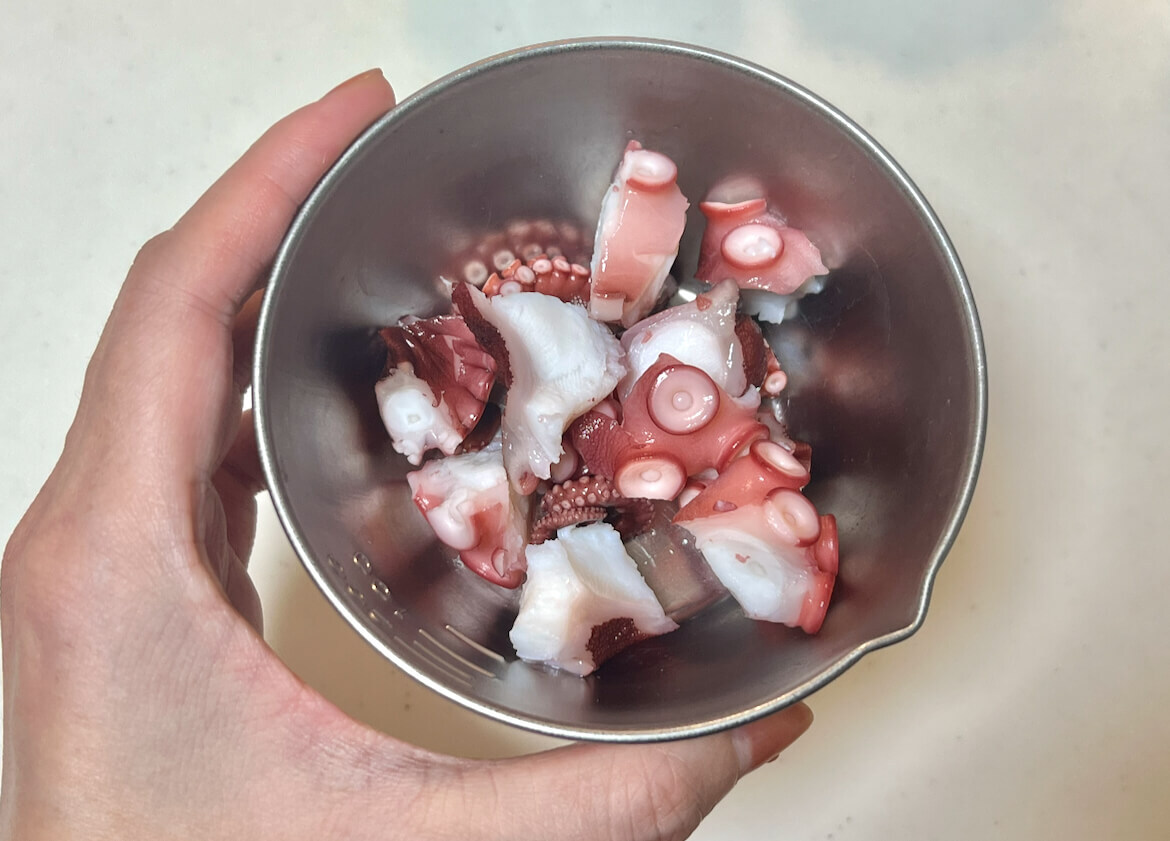 いつもの卵焼き器で、たこ焼きの具材を焼いているなんてとっても不思議な気分です(笑)。