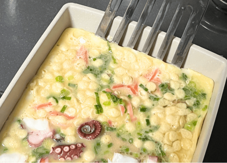 しかも、たこ焼き器で作るたこ焼きは技術が必要ですが、卵焼き器で作るたこ焼きなら四角い形にそってパタンと折りたたんで焼いていくだけなのでコツいらず!
