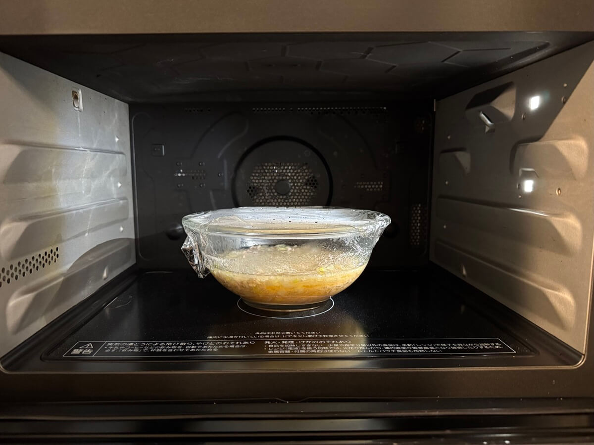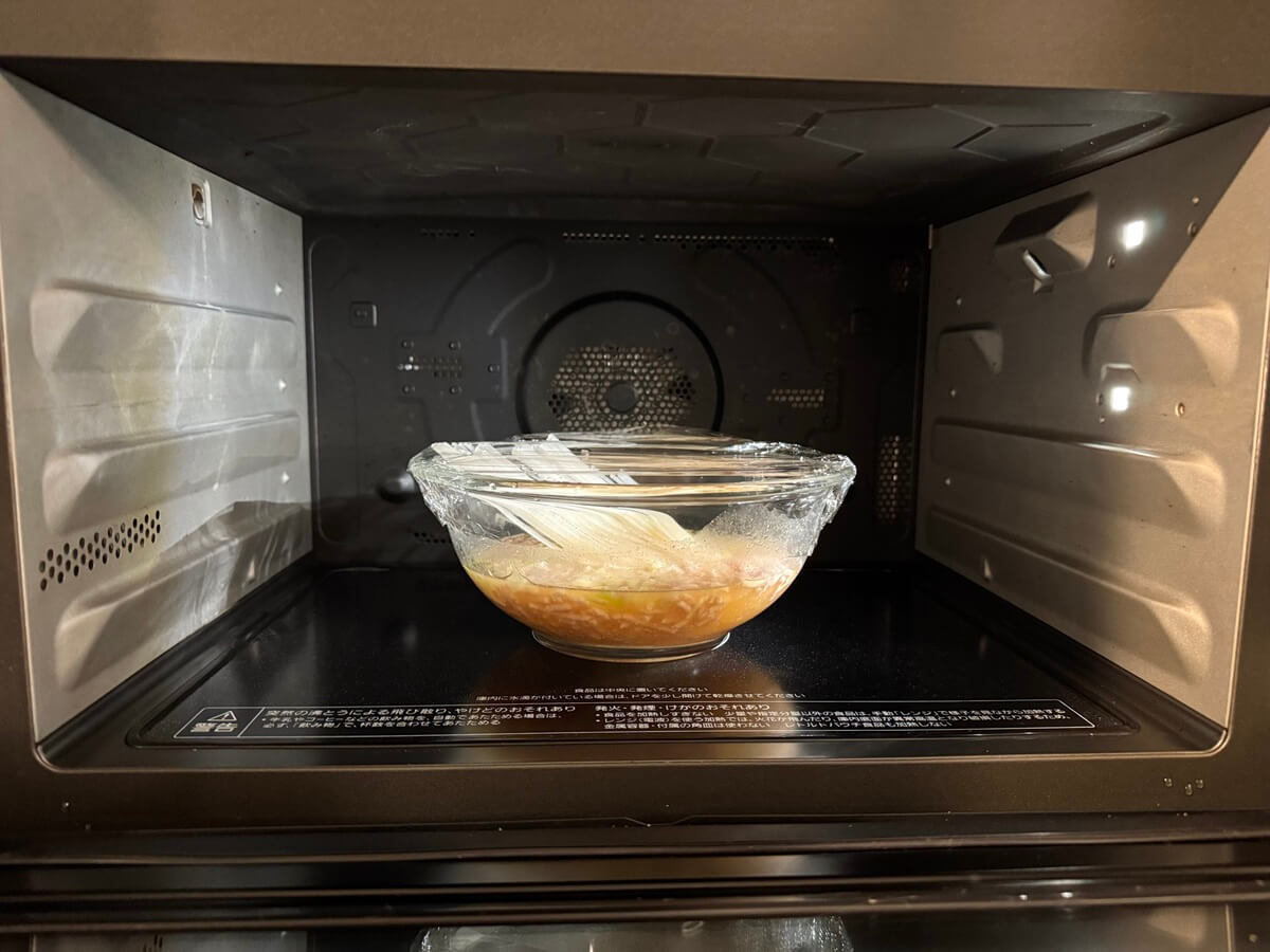 ふんわりラップをかぶせ、600Wの電子レンジで5分加熱します。