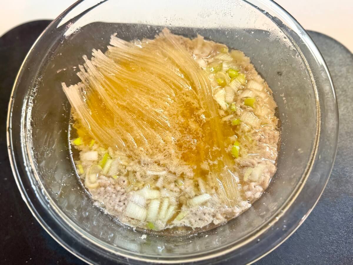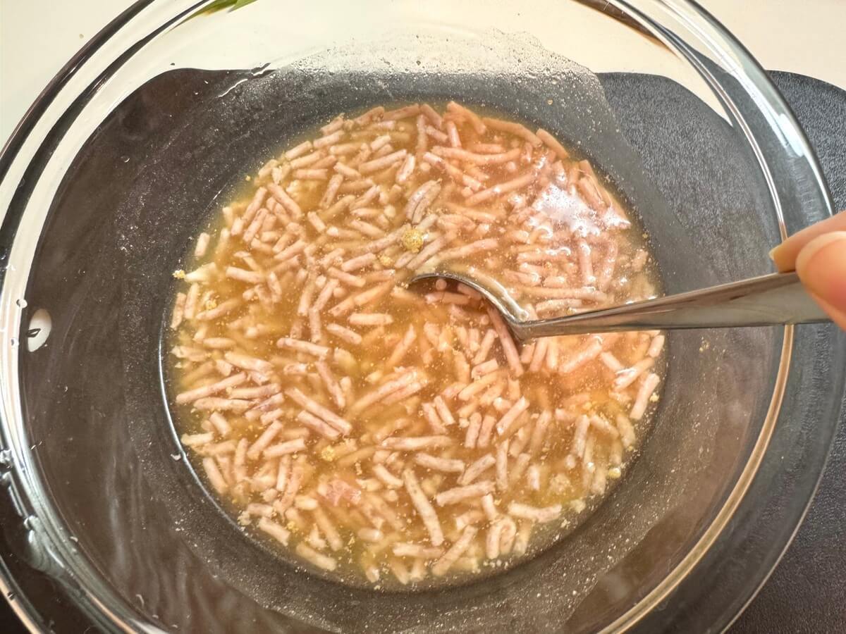 乾燥マロニーをさっと水(分量外)にくぐらせてから、具材の入ったボウルに入れましょう。