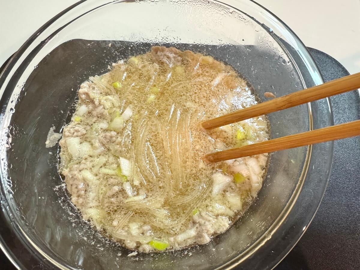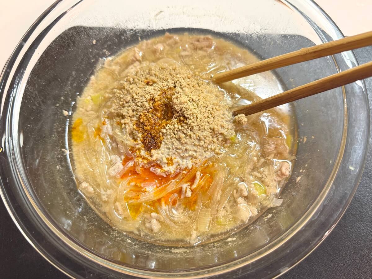 1回目のときよりも豚ひき肉の脂が出ていて、しっかり火が通ったことが分かります。豚ひき肉のあまい香りがします。