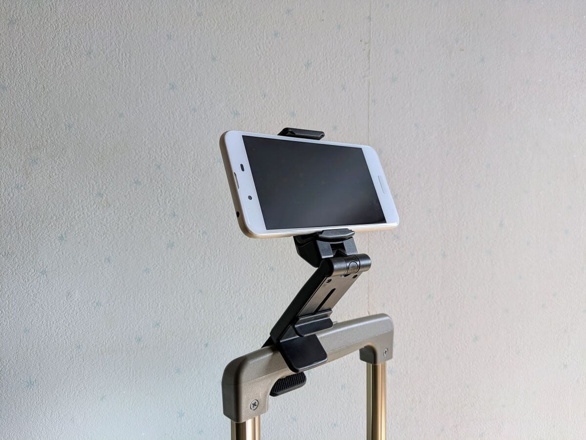 キャリーバッグの持ち手やテーブル、棚などにパチッと挟むだけで、安定したスマホスタンドになります。