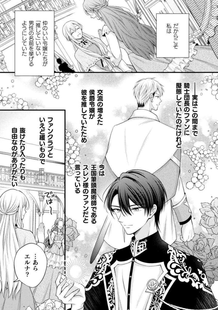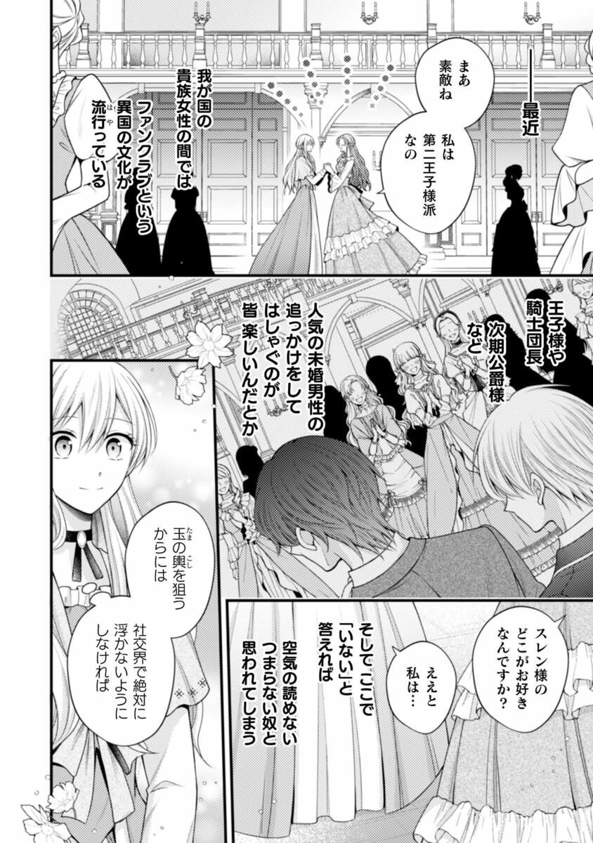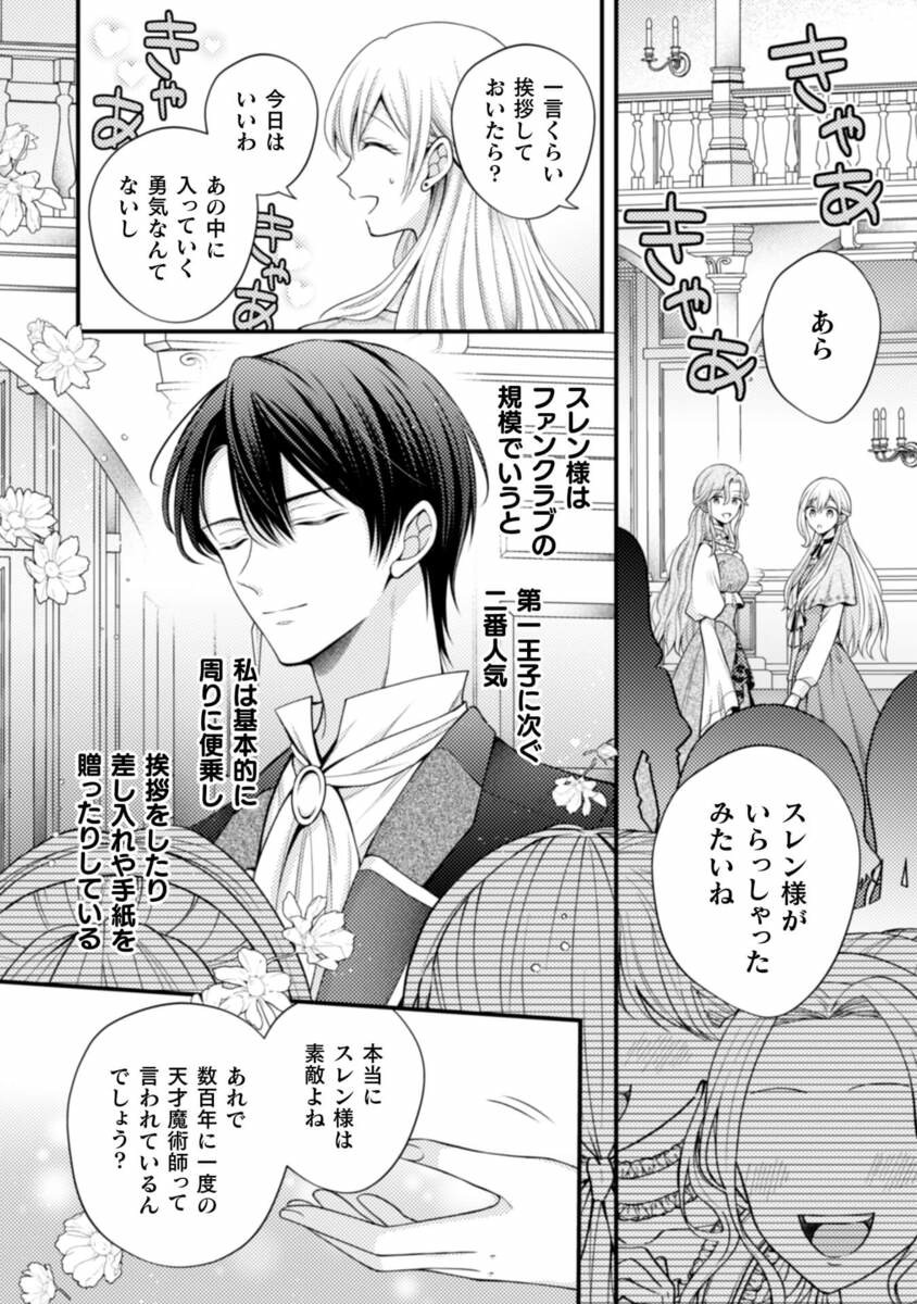 そのためには周りから浮いてはマズいと、社交界で大ブーム中の「ファンクラブ」文化にも便乗。王国筆頭魔術師であるスレンを推しているフリをしていた。