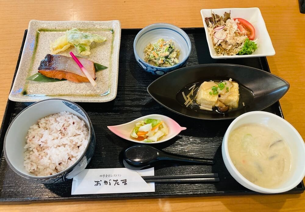 悩みに悩んで、「レストランおがたま」さんの日替わりランチを頂きました。焼き魚や揚げ出し豆腐などボリューム満点!それでいておなかに優しい内容です♪