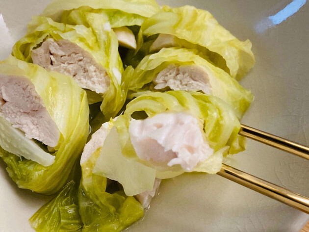 ささみ2本につき、キャベツ2枚で巻きましょう。計2つの大きめのロールキャベツが出来上がります。