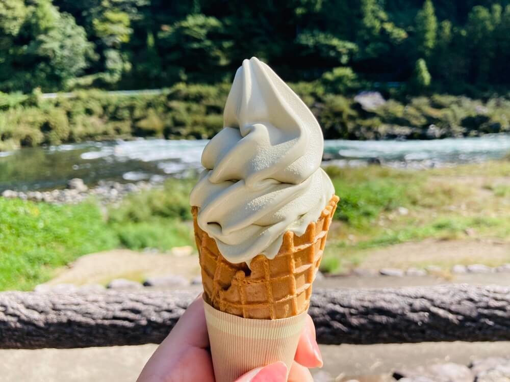 道の駅美並で食べられる、モロヘイヤ味のソフトクリーム(450円)。バニラ味とメロン味(各450円)もあります。