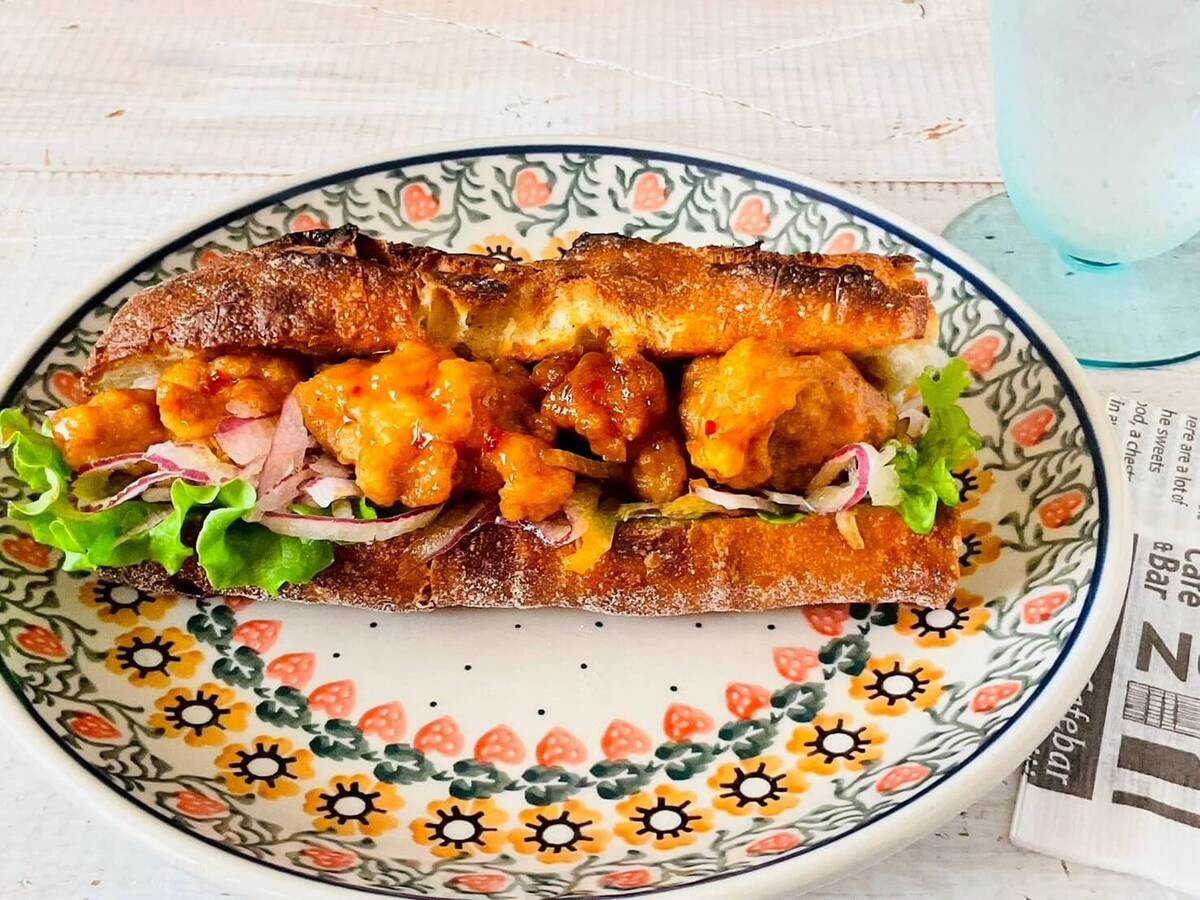 まずは、サンドイッチの具材にしてみました。トースターで温めたバゲットに、マヨネーズやマスタードをたっぷり塗って、野菜と一緒に挟むだけ。ロールパンや食パンでもおいしくできますよ。