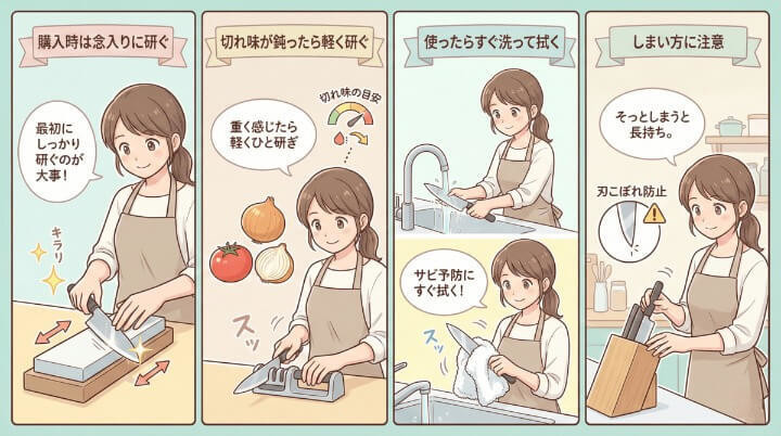 - 購入時は念入りに研ぐ