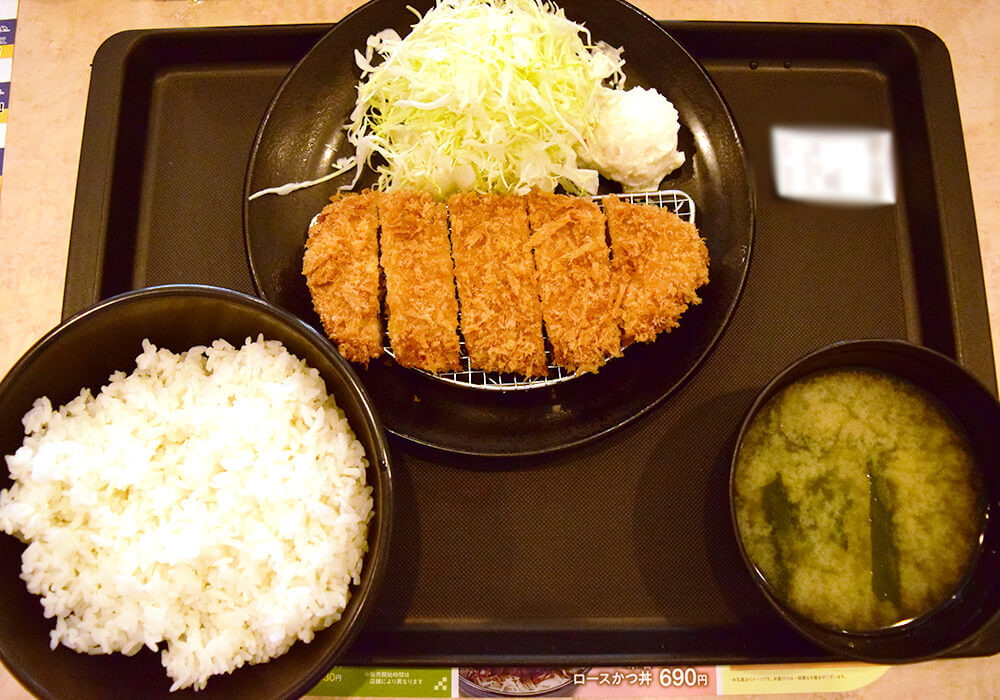 ちなみに「得朝ロースかつ定食(小鉢無し)」も「定食」メニュー扱いで、ごはんとみそ汁は無料。店舗によって対応が違うかもしれませんが、私が利用した店舗はそうでした。お得すぎ。