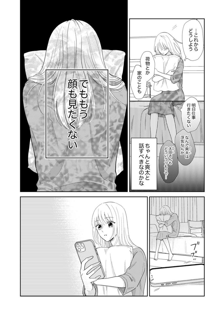 すれ違いを解消すべく、いつもより早めに仕事を切り上げて家に帰ると、爽太と後輩の春陽との浮気現場に遭遇! 突然の出来事に混乱するも、気丈に振る舞い家を出ていく香澄。