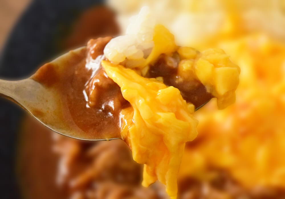 ハヤシソースのしっかりとしたコクに、オム玉子のまろやかさが合わさって、やさしい味わいに仕上がっています。