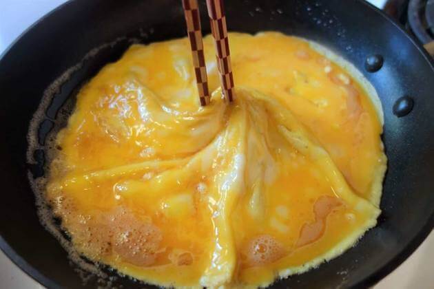 10秒ほど熱してふちが固まってきたら、菜箸を大きく広げて卵の外側からつまむようにして中央にたぐりよせます。