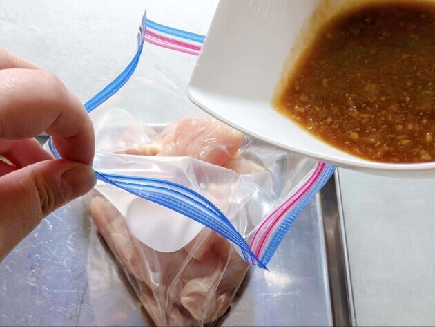 冷凍用保存袋に鶏肉を入れ、その後【A】を加えます。